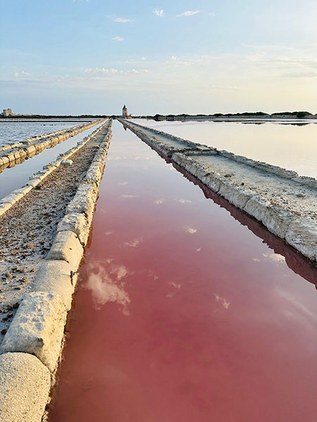 Tutto ritratto in questo scatto, dove il canale della salina porta lo sguardo verso il mulino all’orizzonte. La varietà di sfumature e di colori, completano la riuscita dell’immagine.