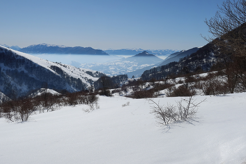 Neve, foschia all’orizzonte, intorno le montagne che circondano l’Altopiano del Voltigno sul Gran Sasso e in primo piano un cespuglio. Uno scatto, quello proposto da Donato Di Natale, certamente essenziale, ma ben calibrato per quanto riguarda l’esposizione e il controllo della luce oltre che dal punto di vista della composizione.